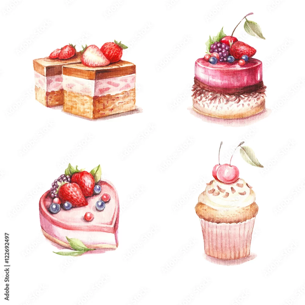 Naklejka na ścianę Zbiór różnych odmian ciast. Akwarela ilustracja
