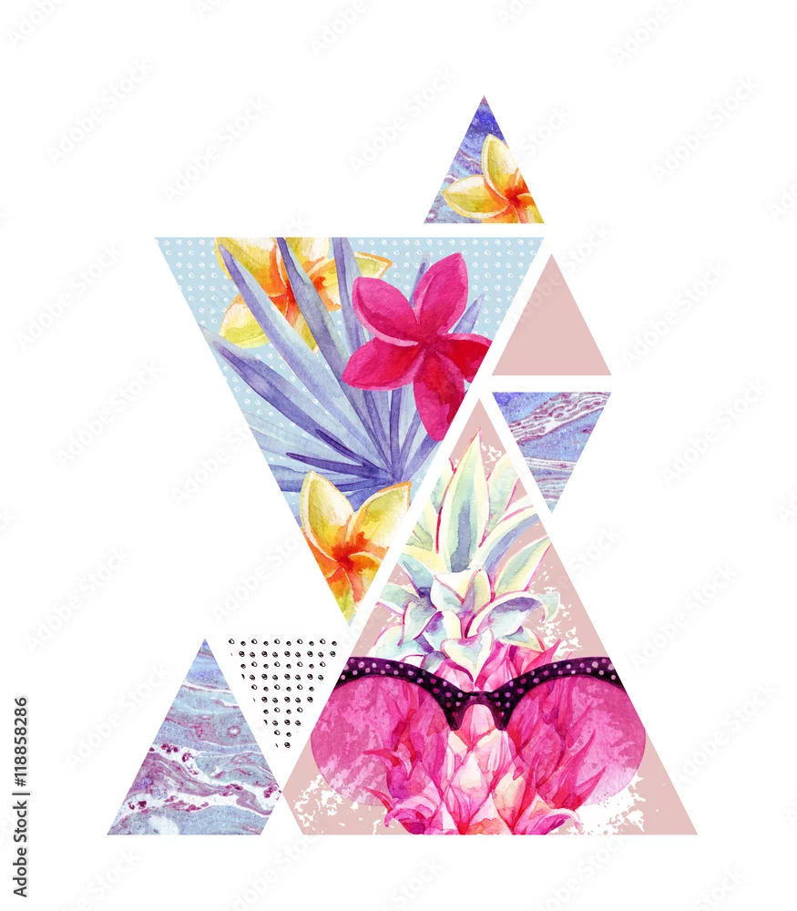 Naklejka na ścianę Trójkąt z okularami przeciwsłonecznymi, liściem palmowym wachlarza i ananasami.