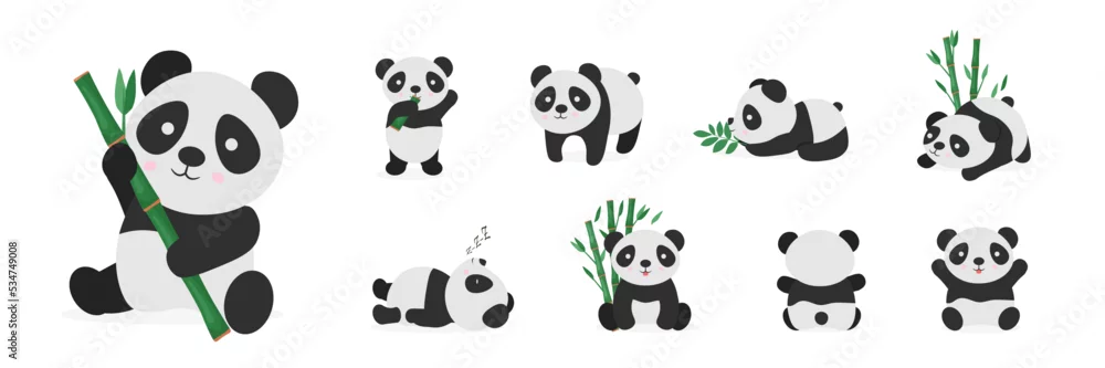 Cute pandas flat vector color illustrations set. Baby panda bear in different poses cartoon character. Sleepy and lazy animal. Asian wildlife. Rainforest, jungle mammal eating bamboo