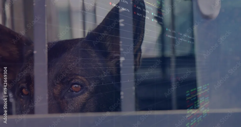 Naklejka na ścianę Gazing dark-coated dog peering through vertical bars and divider, showing collar and code on glass - psy - Picturewall.pl