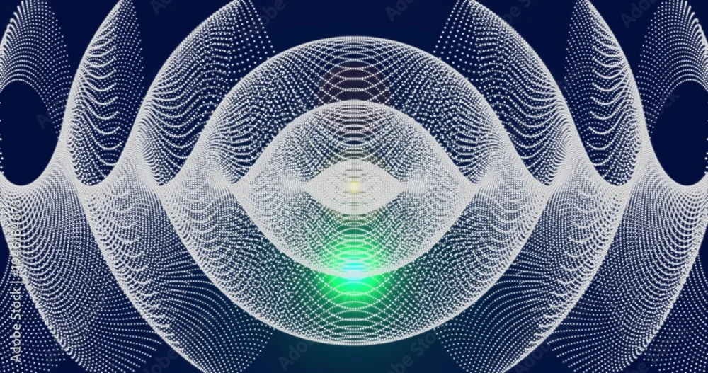 Naklejka na ścianę Displaying ringed mesh pulsating in deep navy with white point cloud, green core, dotted arcs