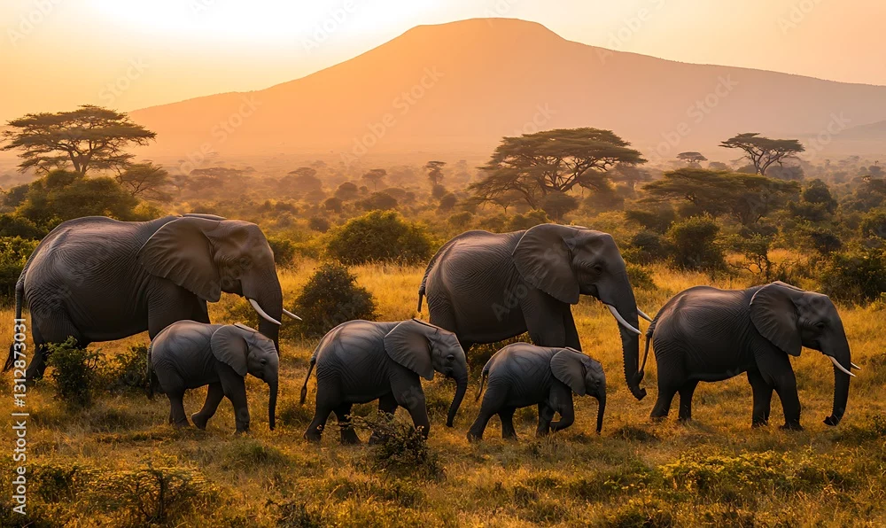 Naklejka na ścianę African Elephant Family at Sunset in the Savanna