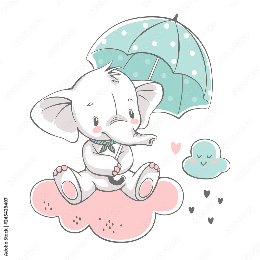 Naklejka na ścianę Wektorowa ilustracja śliczny dziecko słoń, siedzi na chmurze z zielonym parasolem.