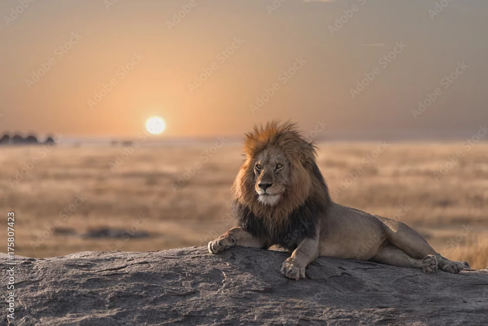 Obraz Samiec lwa siedzi na szczycie skały i szuka swojego obszaru. Wygląda tak wspaniale.