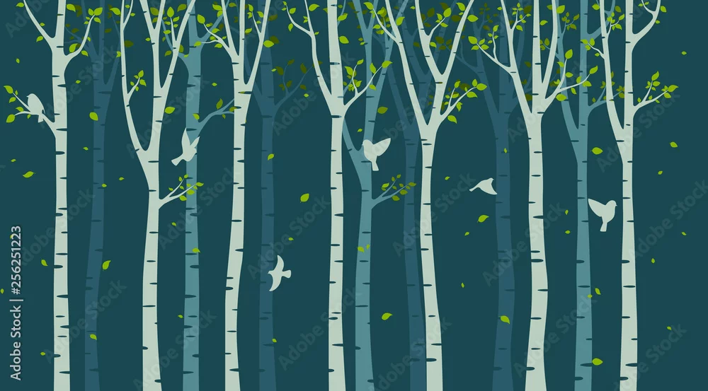Obraz Brzozy, drzewa, i ptaki na ciemnym tle