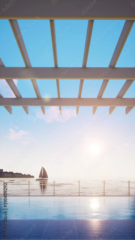 Obraz taras z widokiem na wodę i błękitne niebo