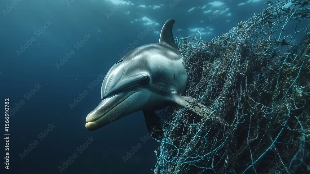 Obraz A playful dolphin entangled in underwater fishing nets, showcasing the impact of marine pollution.