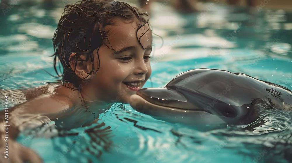 Joyful child interacts with a dolphin in crystal clear waters. playful and heartwarming encounter. marine life and youthful curiosity captured. AI