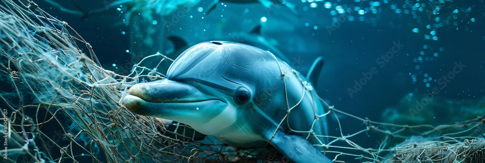 Obraz Trapped dolphin in underwater net, emphasizing the dangers of fishing gear to marine life and environmental protection