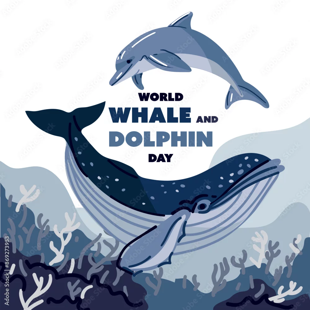 World Whale and Dolphin Day, July 23rd. A poster for the holiday. Whale and dolphin illustration. Marine animals swim in the ocean, the concept of environmental protection. Ocean Day. Underwater world