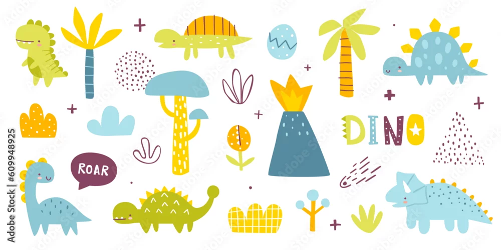 Obraz Cute dino colorful set. Naive dinosaurs collection for baby boys. Abstract vector dino bundle.