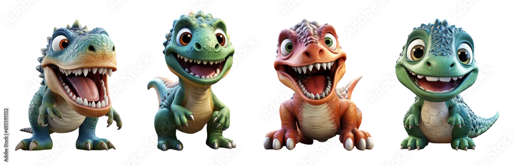 Obraz 3d illustration set of t rex dinosaur cartoon characters on transparent background, generative ai