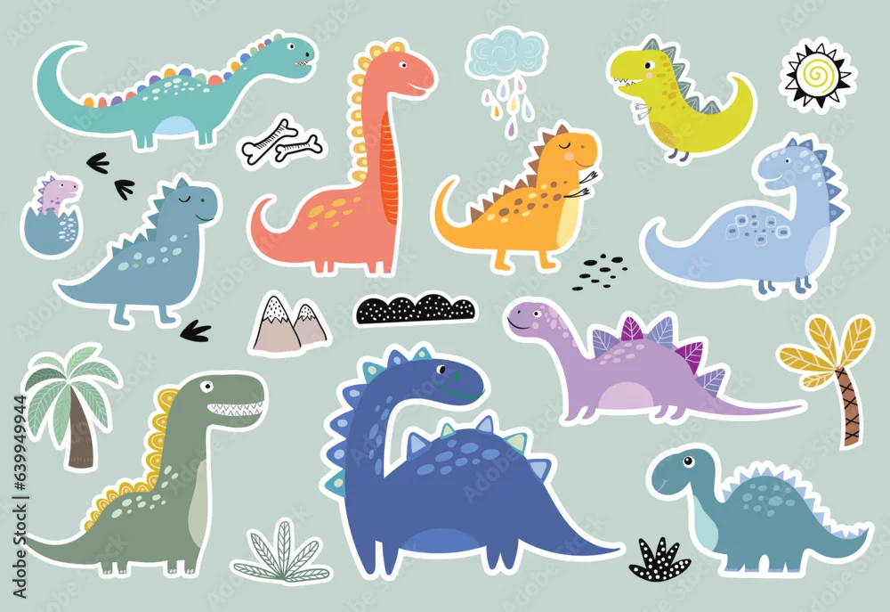 Obraz Decorative stickers collection with different types of cute and funny dinosaurs, vector design for kids - dinozaury - Picturewall.pl