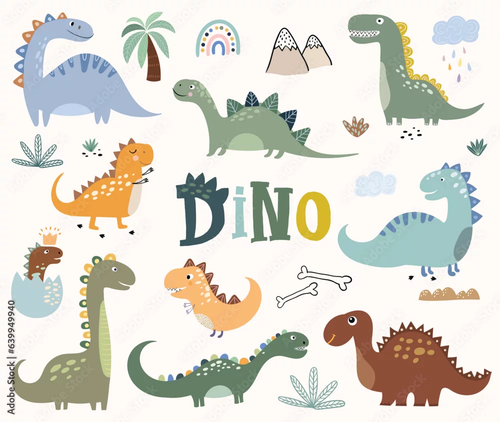 Obraz Funny dinosaurs collection with different types of cute animals, vector illustration isolated on white background - dinozaury - Picturewall.pl