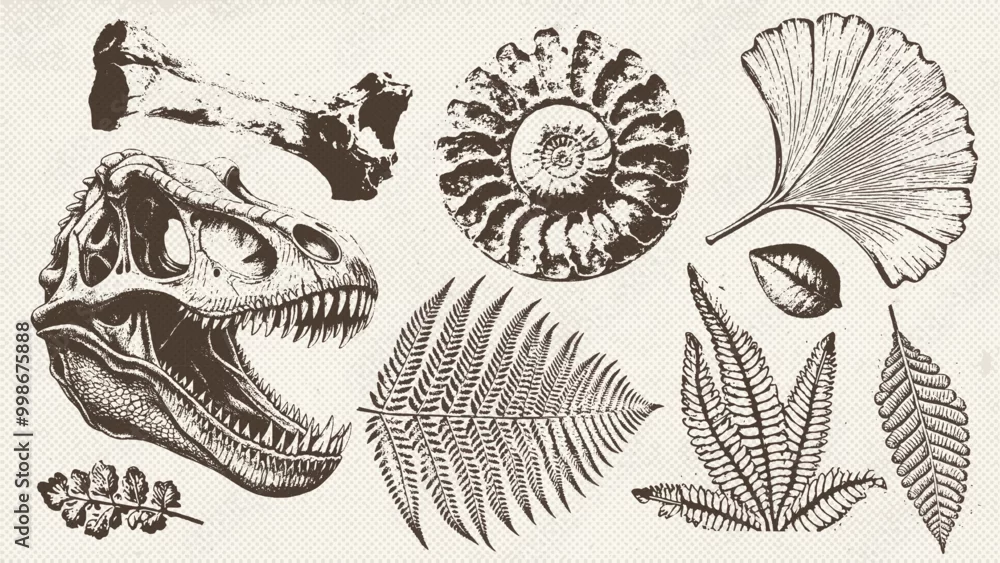 Obraz Prehistoric ammonite shell, dinosaur skull, ancient leaves imprints set . Dinosaur and prehistoric period collection of icons in monochrome style. Vector