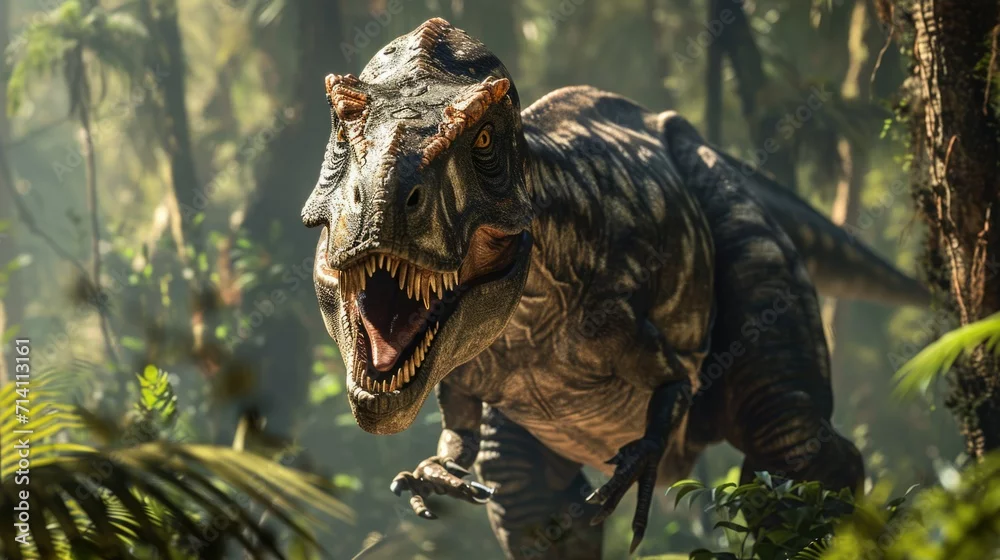 Prehistoric dinosaur era. Jurassic period park. Ancient extinct animal. Wild dangerous dino with sharp teeth. Big scary tyrannosaurus tropical jungle. Wildlife many years ago. Powerful predator walk.