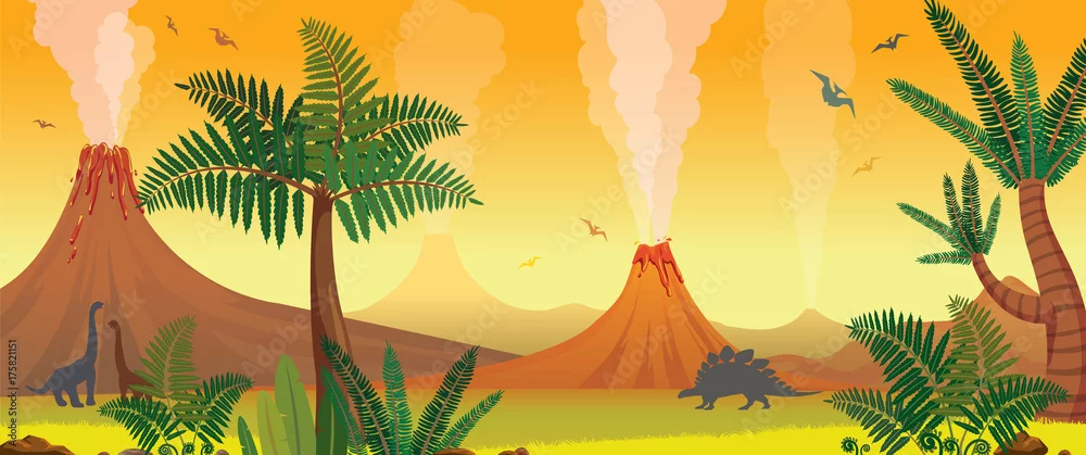 Obraz Prehistoric nature landscape - volcanoes, dinosaurs, fern. - dinozaury - Picturewall.pl
