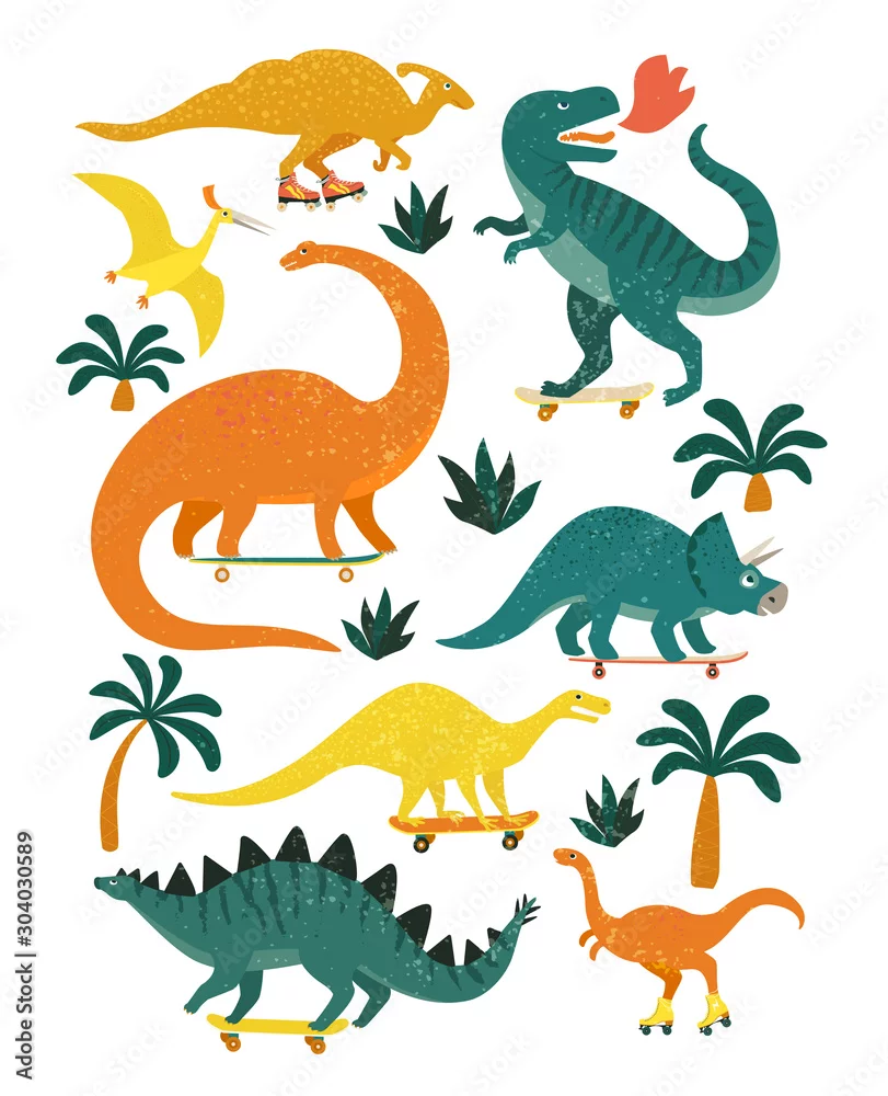 Obraz Set of dinosaurs including T-rex, Brontosaurus, Triceratops, Velociraptor, Pteranodon, Allosaurus, etc. - dinozaury - Picturewall.pl