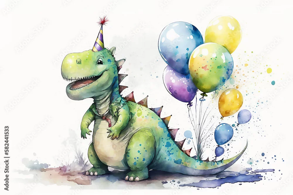 Watercolor illustration of cute dinosaur with colorful balloons. Greeting birthday card, poster, banner for children. White background. AI generated
