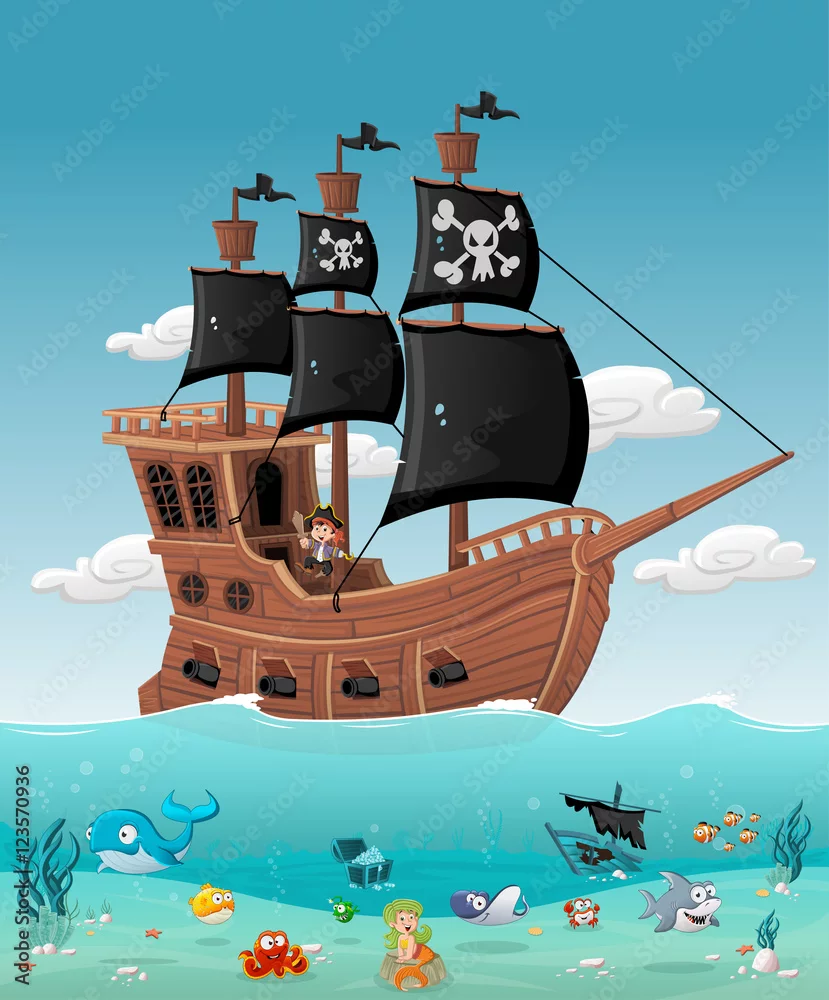 Obraz statek piracki z piratem na pokładzie - dla dzieci - Picturewall.pl