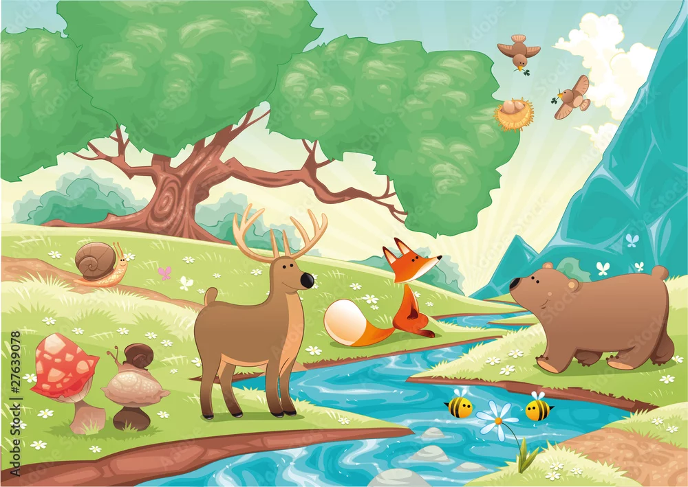 Obraz zwierzęta w lesie nad rzeką - dla dzieci - Picturewall.pl