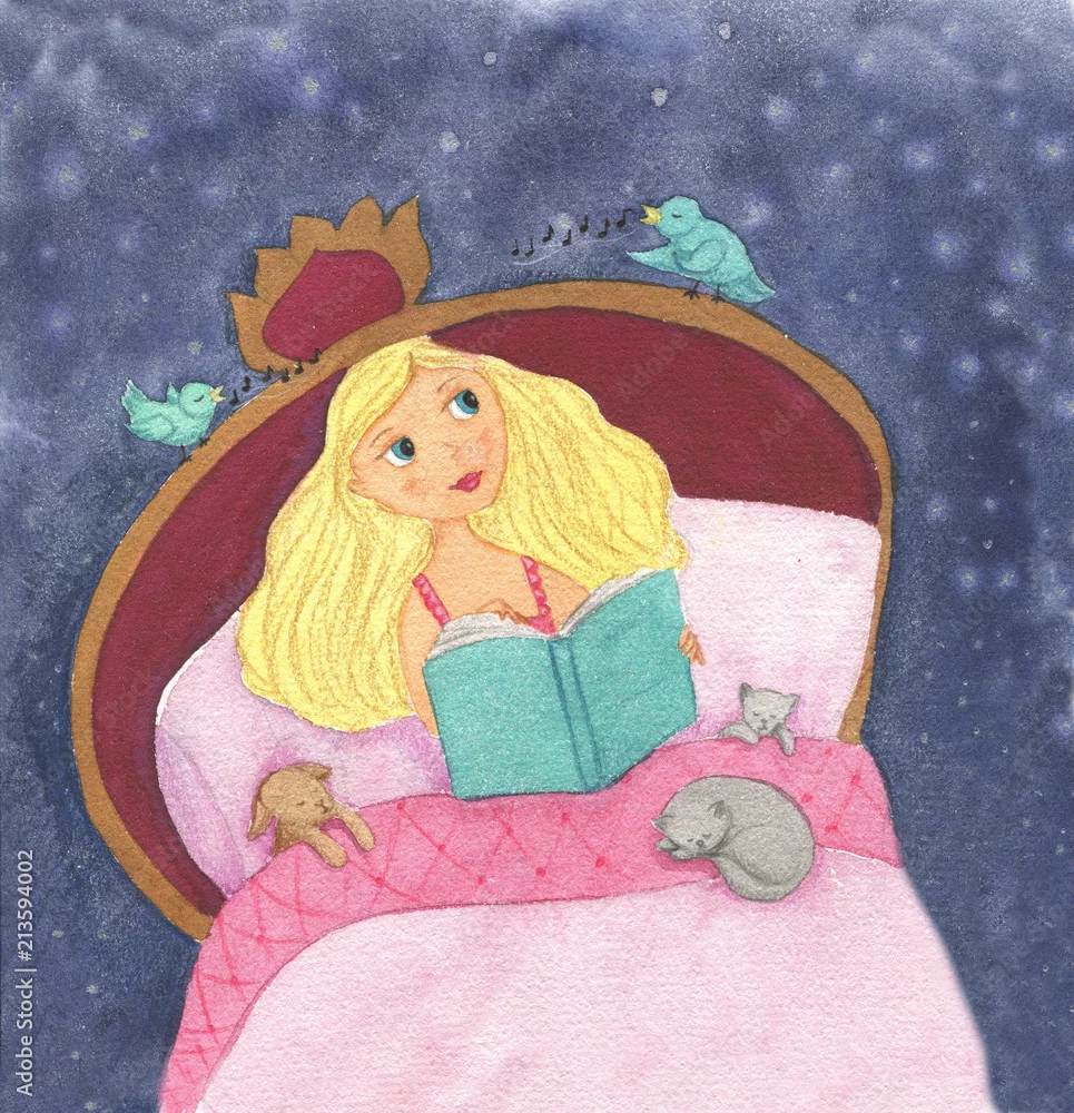 Obraz Dziewczyna z książką w łóżku - dla dziewczynki - Picturewall.pl