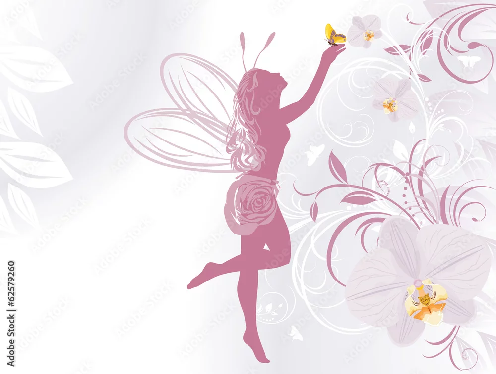 Obraz Wróżka i motyl na dekoracyjne tło z orchidei