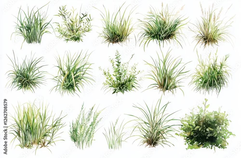 Obraz A collection of modern, hand-drawn tropical plant graphics in a minimal style, showcasing watercolor bush and shrub illustrations for architectural and landscape designs.