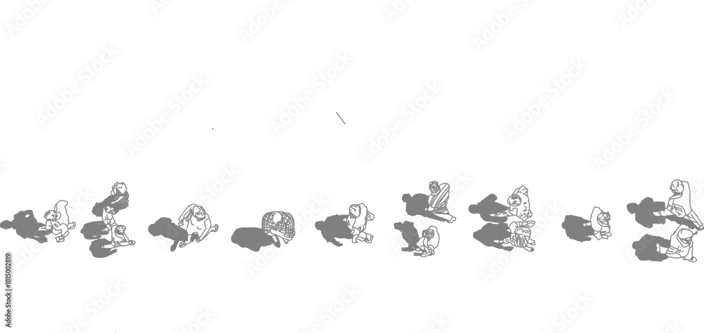 A collection of top view vector people figures with gray shadows underneath, showing groups and couples, useful for realistic architectural plans.