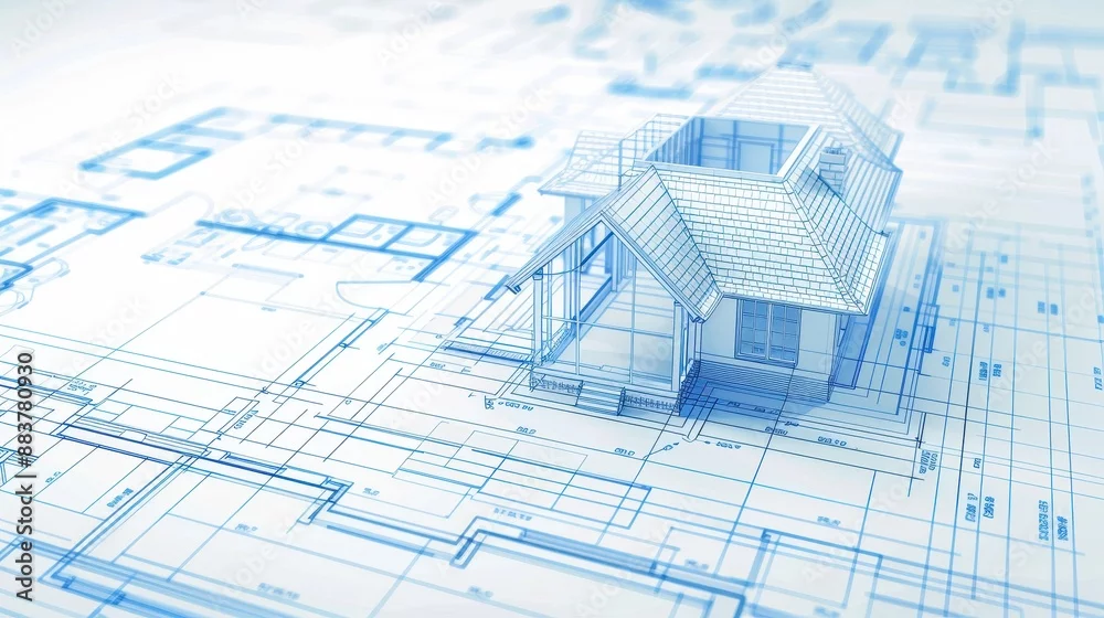 Obraz Architectural blueprint and model house showcasing building design, construction plans, and architectural drawing for real estate development.
