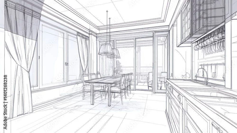 Obraz Architectural drawing depicting a modern dining and kitchen interior space