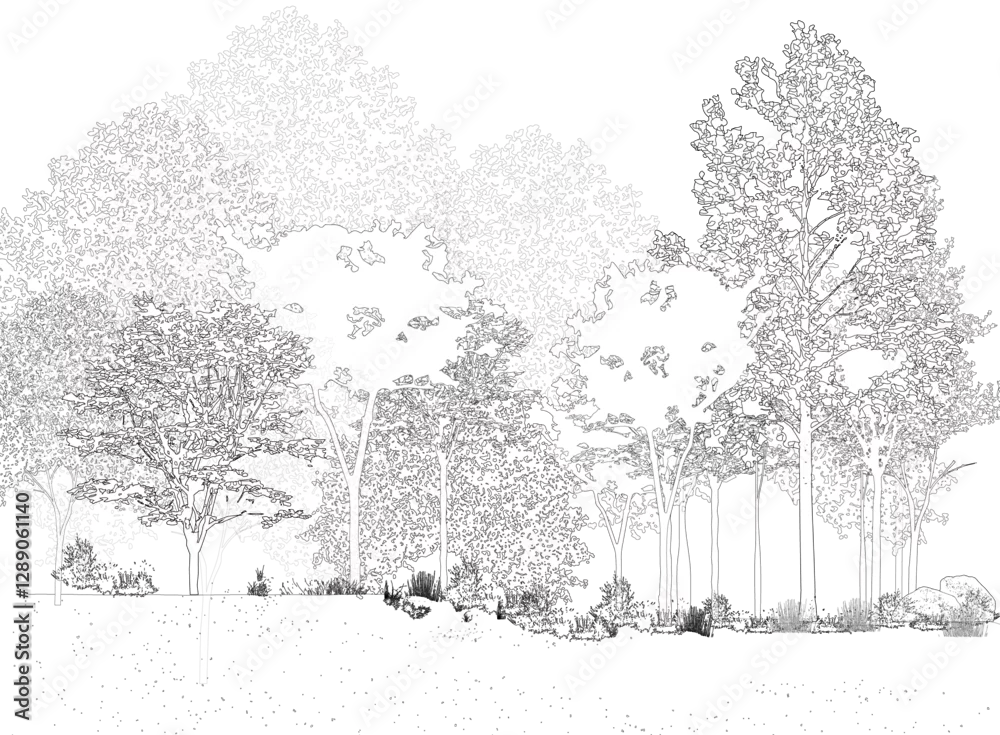 Obraz Architectural Drawings, Minimal style cad tree line drawing, Side view, set of section wetland forest outline for landscape design drawing. Vector illustration in seperate element