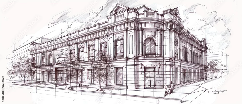 artistic architectural sketch hand-drawn concept of a neoclassical commercial building, capturing the essence of architectural design with artistic flair.