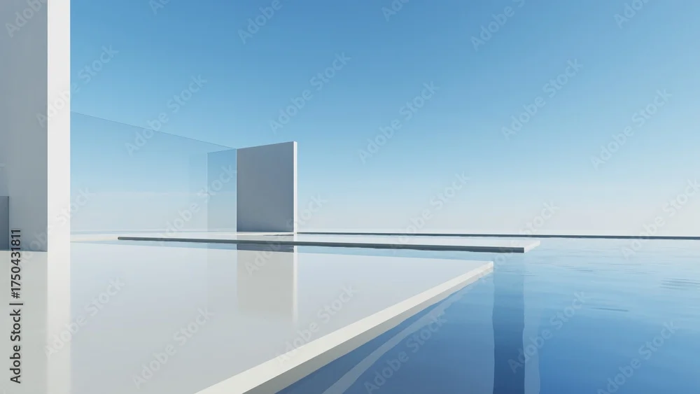 3d render of abstract modern geometry architecture with empty cement floor and water, Minimal white building with exterior pool against blue sky background