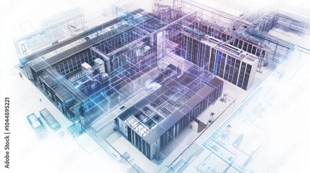 detailed architectural layout of data center, showcasing organized server racks and infrastructure. design emphasizes efficiency and modern technology, creating visually striking representation of