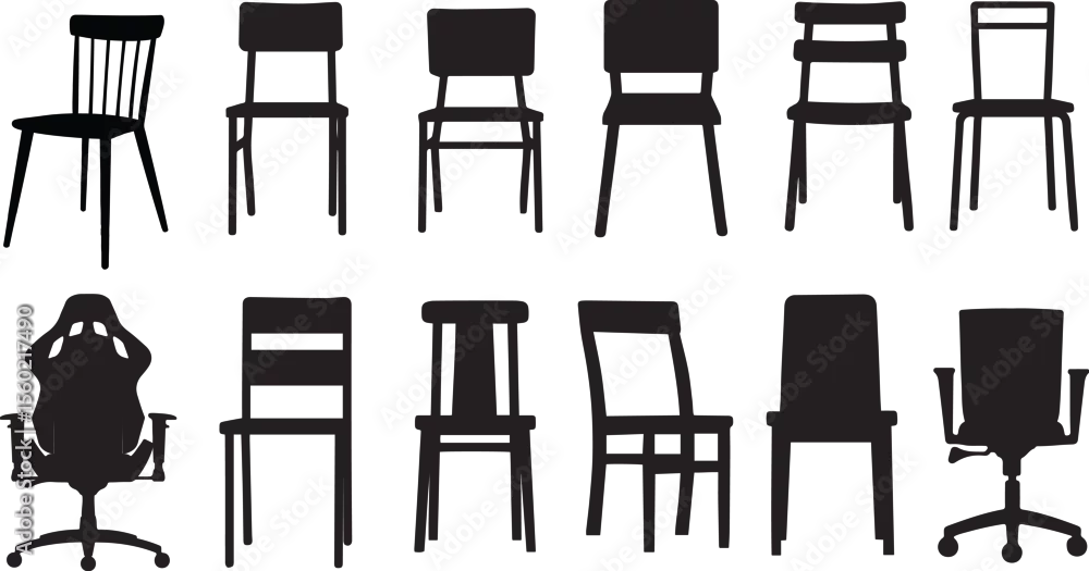Obraz Diverse set of black chair silhouettes, featuring various styles from classic dining to modern office and gaming chairs, perfect for interior design, furniture, and architectural projects- do architekta - Picturewall.pl