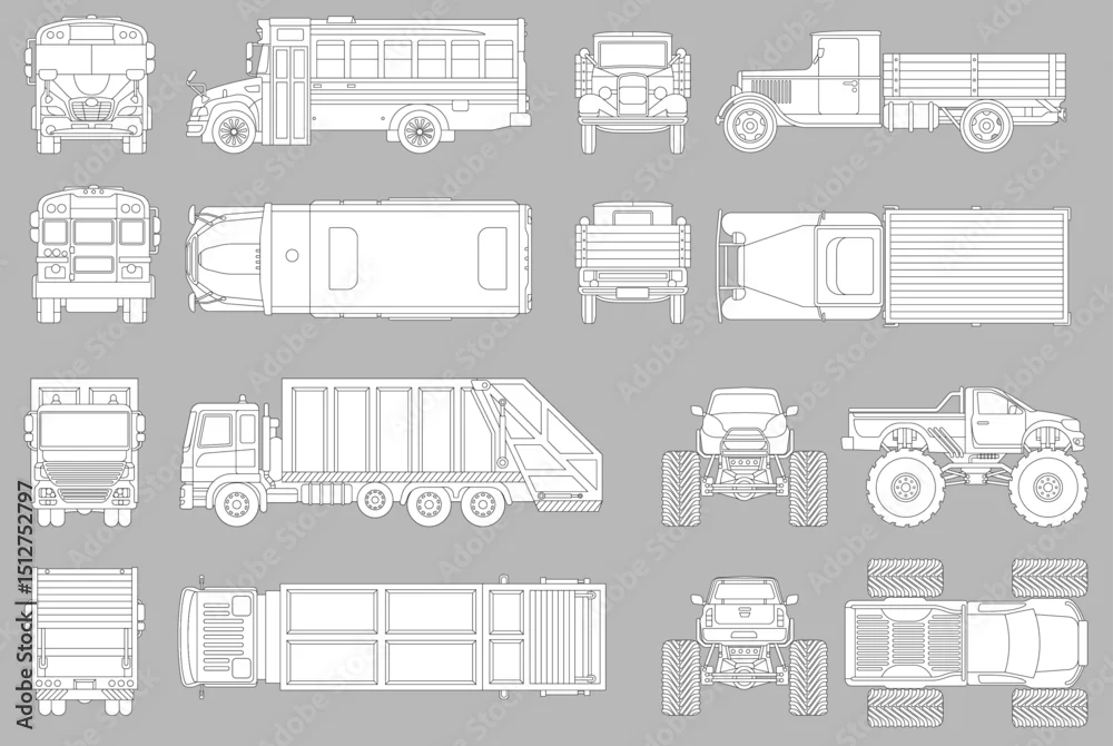 Obraz Flat vector line industrial vehicle design illustration of cleaning truck and school bus and agricultural tractor - do architekta - Picturewall.pl