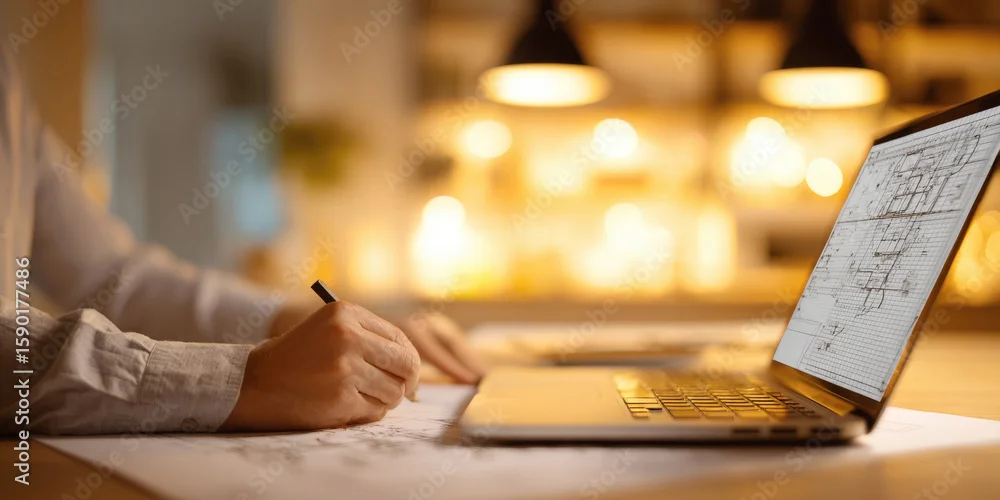 Obraz Focused individual's hands are shown meticulously drawing on blueprints, with laptop displaying architectural plans open beside them. Concept of professional work in architecture, design, engineering - do architekta - Picturewall.pl