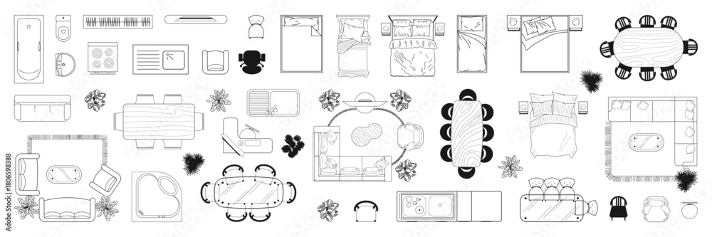 Obraz Furniture outline top view. Floor plan icons set for design interior and architectural project. CAD drawings - do architekta - Picturewall.pl