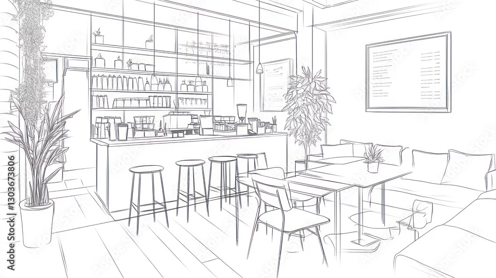 Obraz Interior sketch of a modern cafe, bar seating and tables. Possible use architectural design - do architekta - Picturewall.pl
