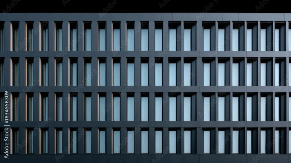Obraz Modern architectural facade featuring geometric patterns and symmetrical window designs against a clean backdrop of dark tones and reflective surfaces