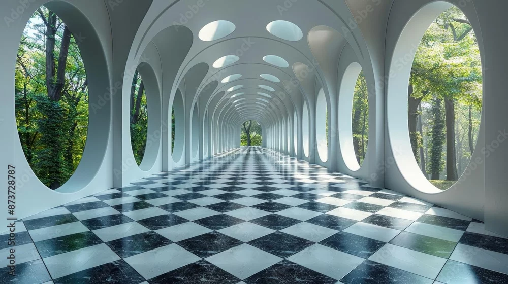 Obraz Modern architectural hallway with large circular windows, checkered flooring, and lush greenery. Futuristic design with natural light.