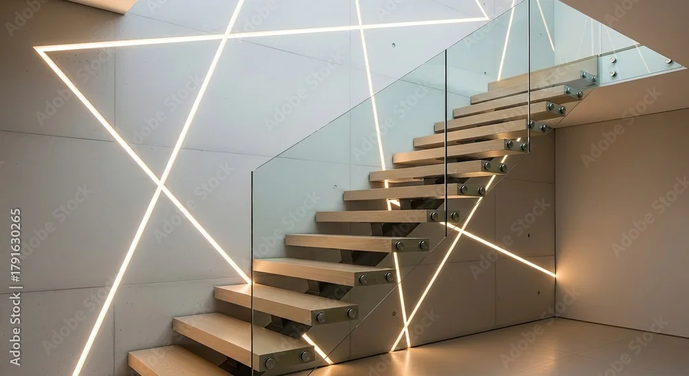 Modern staircase design with wood steps and glass railing, illuminated by geometric lighting creating a sophisticated architectural statement in a stylish home