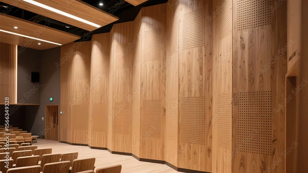 Obraz Modern wooden acoustic panels in a minimalist auditorium, showcasing architectural design and sound - absorbing features.