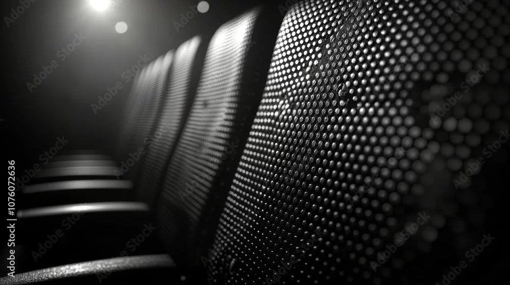 Monochromatic close-up of stadium seating texture and patterns, emphasizing geometric shapes and industrial design through dramatic light and shadow interplay, creating depth and dimension.