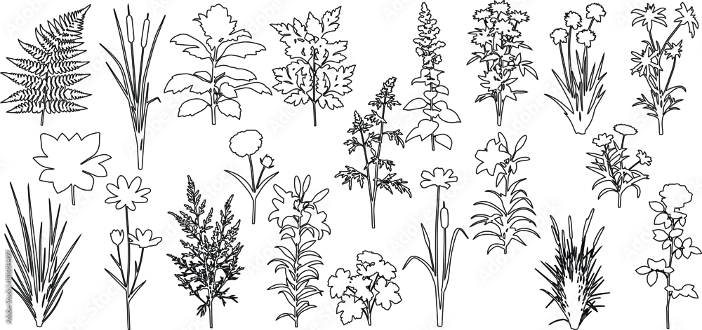 Obraz set of shrubs and grass line cad, Ground cover. Illustration for elevation architectural element, side view, grass section. vector illustration - do architekta - Picturewall.pl