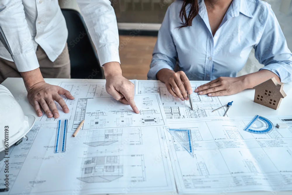 Team of architects or engineering consulting and analyzing working on objects tools and construction drawings inspection, discussing planning new architectural project on blueprint and model house
