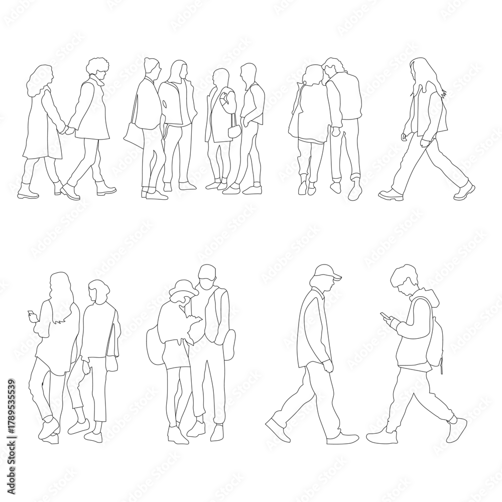 Vector collection of 10 minimalist line art people in motion - walking, chatting, standing in pairs and small groups. Perfect for architectural plans, city visualizations and space design.
