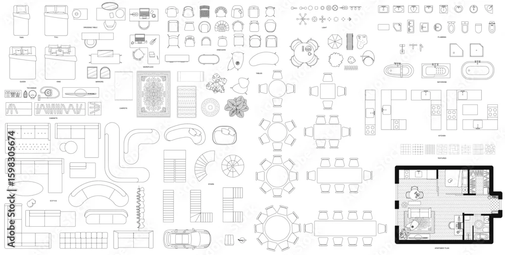 Obraz Furniture in top view. Vector illustration of isolated interior objects on white background.