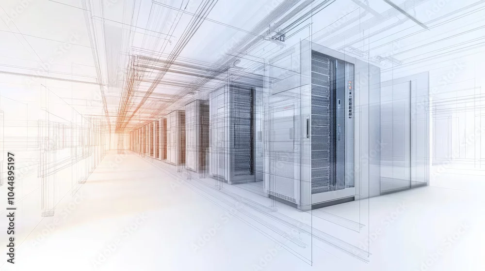 modern architectural design of data center featuring server rooms, showcasing sleek and organized layout with advanced technology. image conveys sense of innovation and efficiency